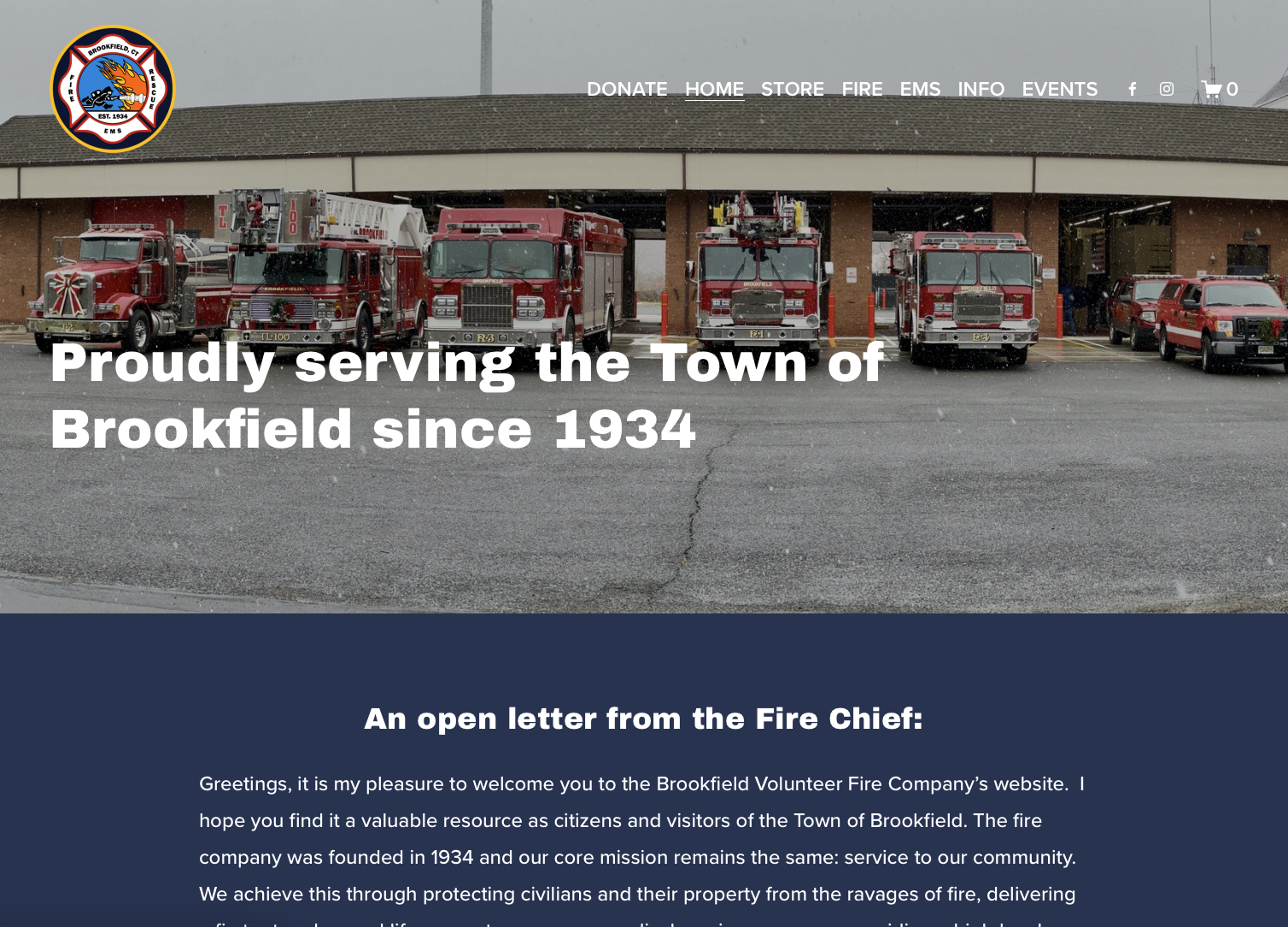 Created for the Brookfield Volunteer Fire Company in Brookfield, CT. Features responsive design, page routes for different domains, and high availability.